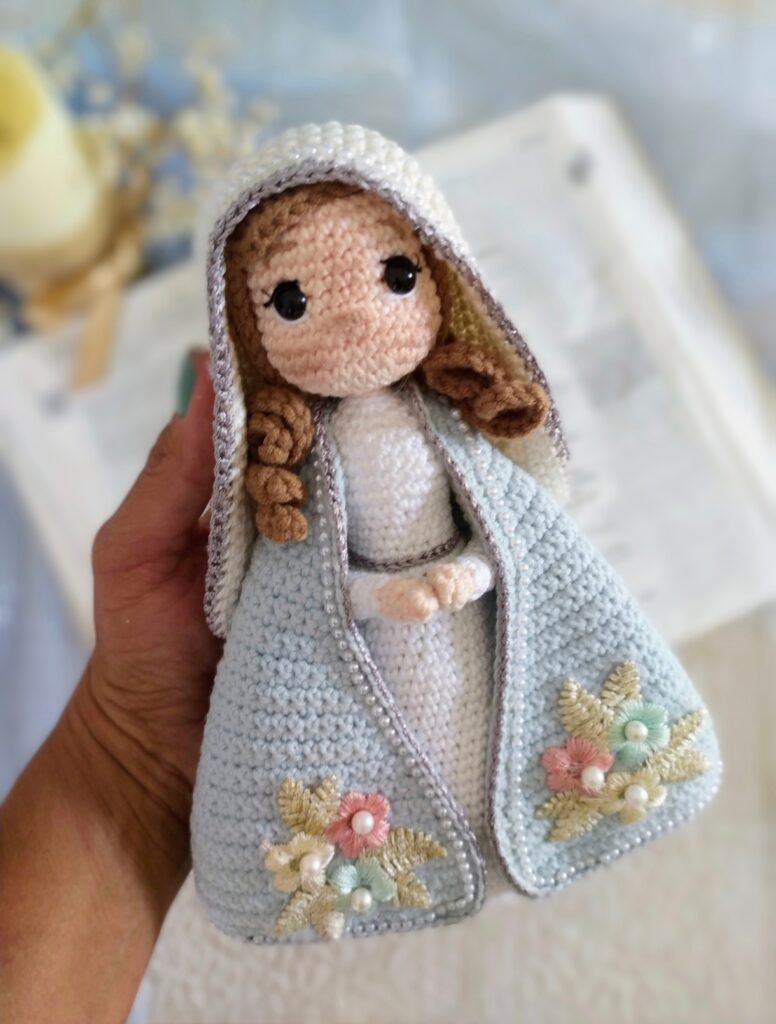 Maria, com a sua serenidade e amor incondicional, é a minha maior inspiração. A sua presença reflete-se em cada obra, guiando-me na missão de confeccionar peças que são mais do que arte, são símbolos de fé.