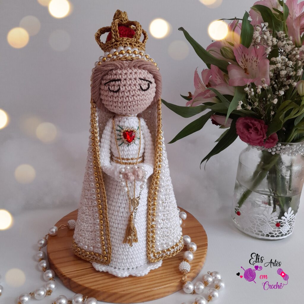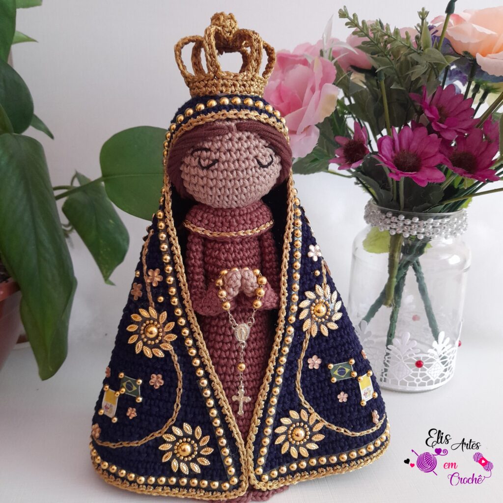 No começo fazia peças para mim, cachecol, alguns tapetes….Algum tempo depois sai da empresa para acompanhar meu esposo, e certo dia resolvi fazer um jogo de banheiro, e mostrei e acabei vendendo, e fiz outro e vendi também… e por um bom tempo fiz jogos banheiro, cozinha.. Quando veio os amigurumis, então resolvi fazer um, me apaixonei, e nunca mais parei. Comecei com os bichinhos, depois fui as Santinhas. Hoje faço somente amigurumi, Amo de paixão. E a amiga que me ensinou o crochê, hoje é também minha cliente. 💕